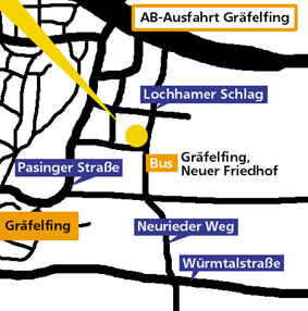 Take bus 268 from Gräfelfing station in the direction to Klinikum Großhadern, get out at Gräfelfing, Neuer Friedhof.Or take U6 from Sendlinger Tor in the direction to Klinikum Großhadern, then take bus 268 from Großhadern station in the direction to Planegg, Bräuhausstraße. Get out at Gräfelfing, Neuer Friedhof.